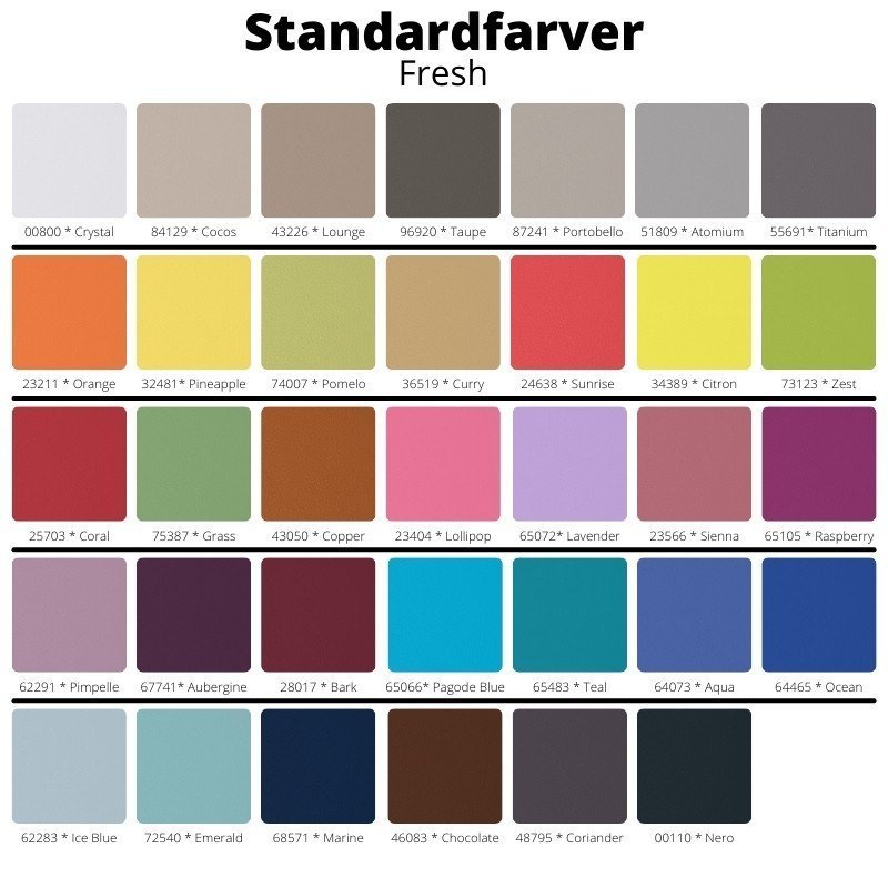 Farvevalg: Leveres i en række standard farver eller i en special farve (farven vælges nedenfor eller skrives i kommentarfeltet ved afslutning af bestillingen - husk da farvenummeret)