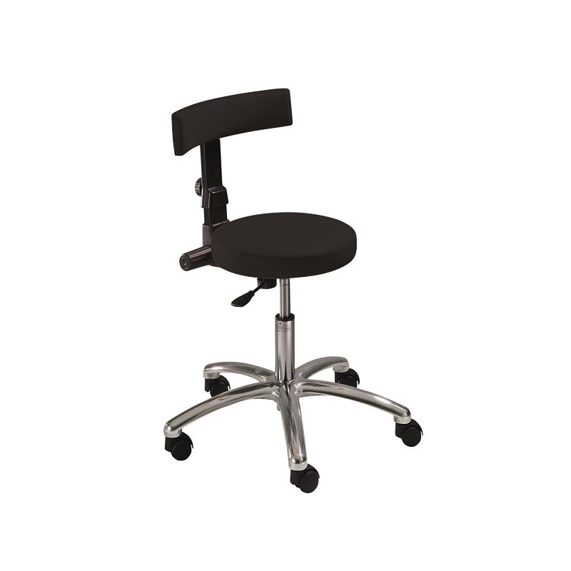 Stool with 5-wheel chrome metal base, adjustable backrest, continuous height adjustment 46-59cm. 7 mm thick easy-to-clean black faux leather upholstery.