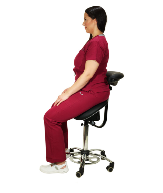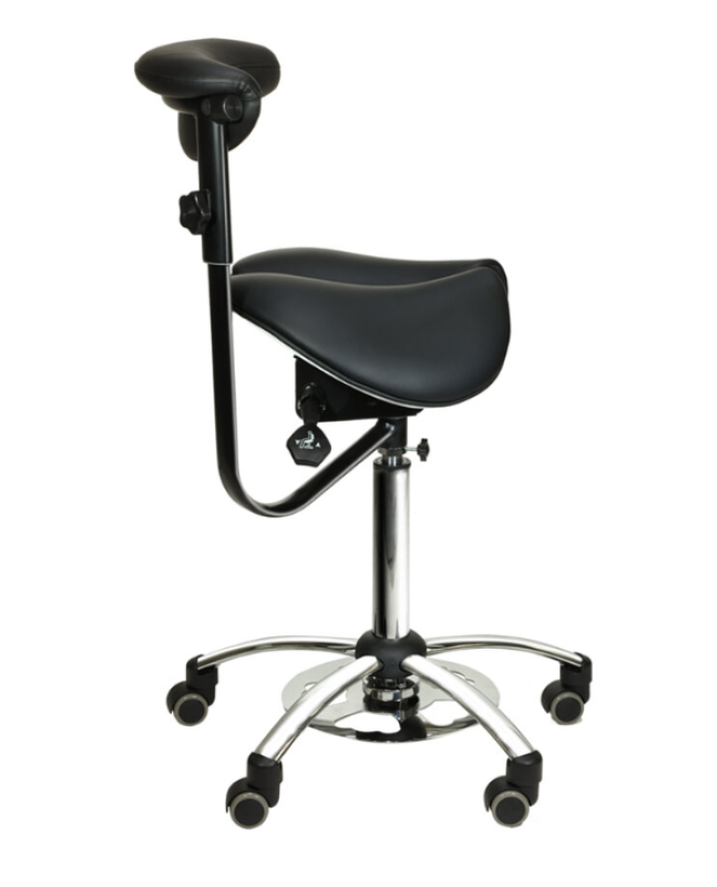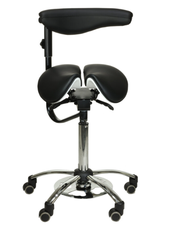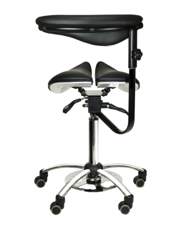 Ergonomic clinic chair with split saddle seat. Adjustable height, angle, and backrest ensure optimal working position in clinic, laboratory, or treatment room. Robust quality and easy to clean.