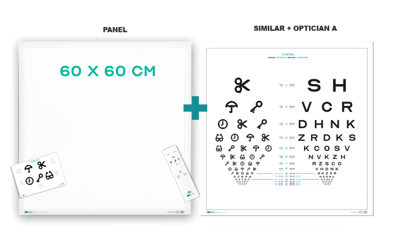 LED panel for interchangeable LOGMAR visual acuity chart fronts with accompanying combination chart for both children and adults. For use at 3 meters.