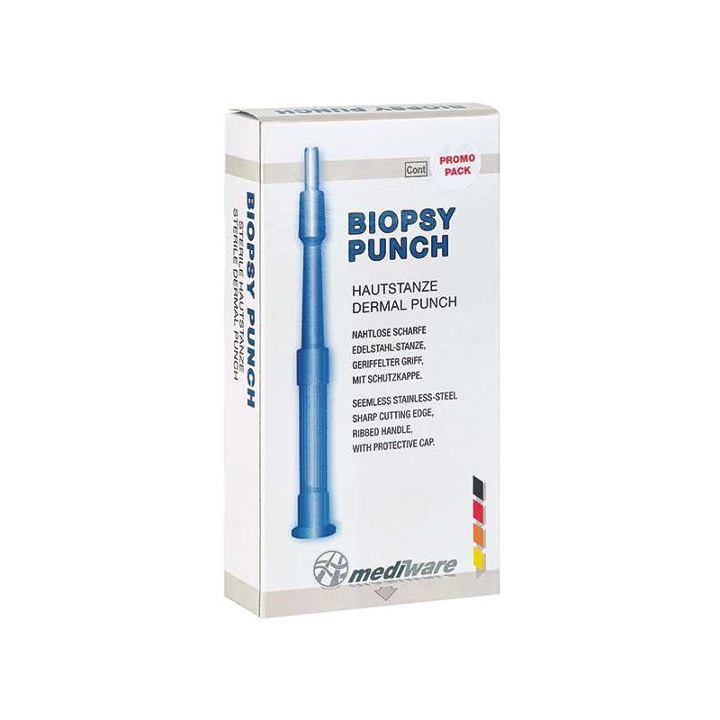 Punch biopsy instrument for gentle biopsy of skin elements. This biopsy forceps is particularly sharp and is made of high-quality stainless steel. With a protective cap for safe disposal. With 10 sterile and individually sealed forceps per box. Single use.